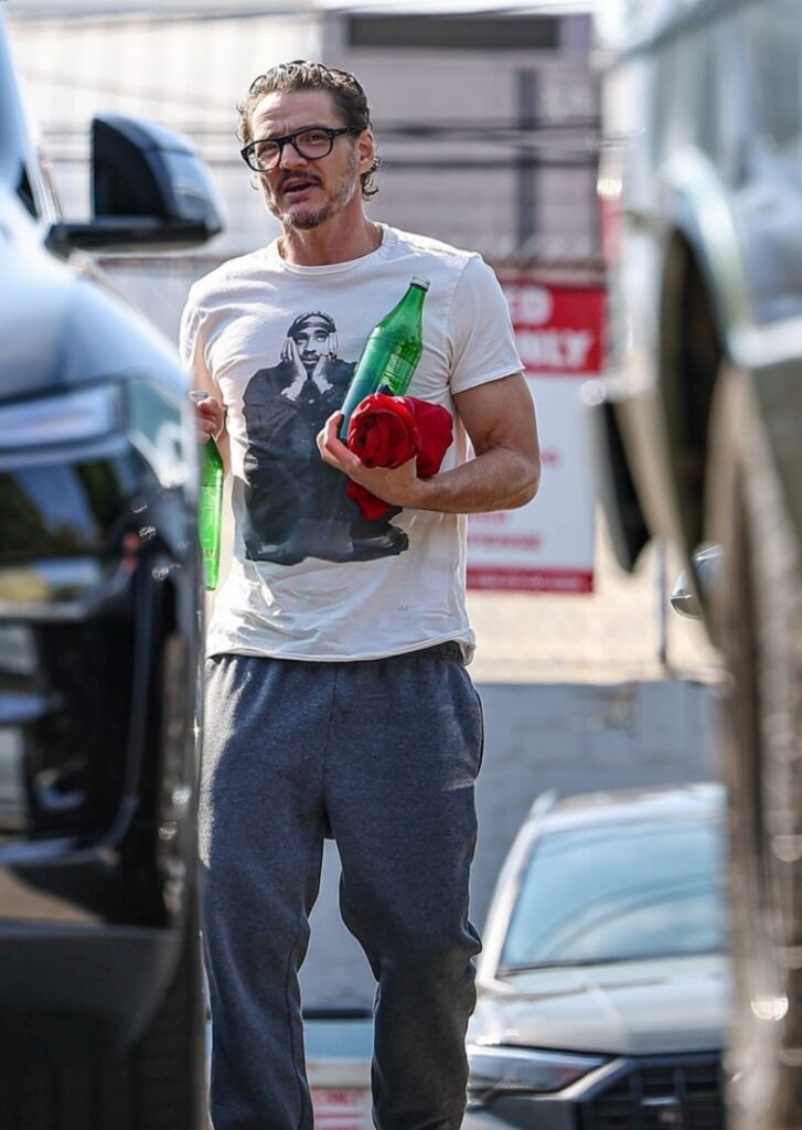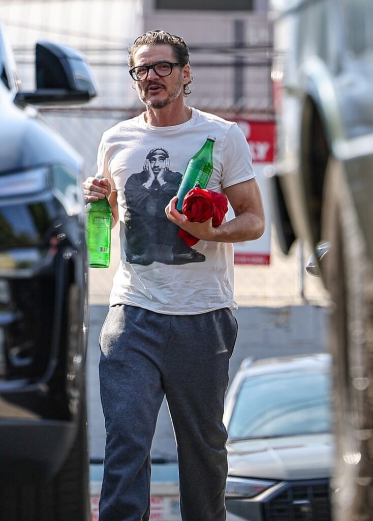 Pedro Pascal se mantém hidratado enquanto malha na academia em Los Angeles.