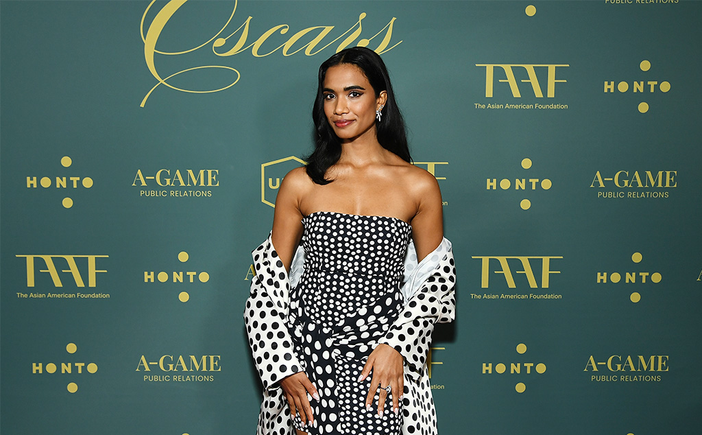 The Pitt actress ditched her scrubs for a chic polka dot number at the “South Asians at the Oscars” Pre-Oscars Party.