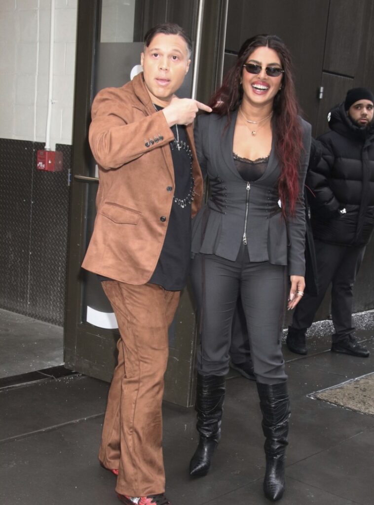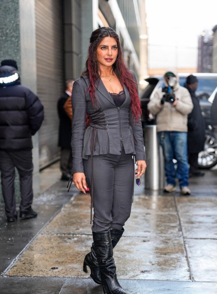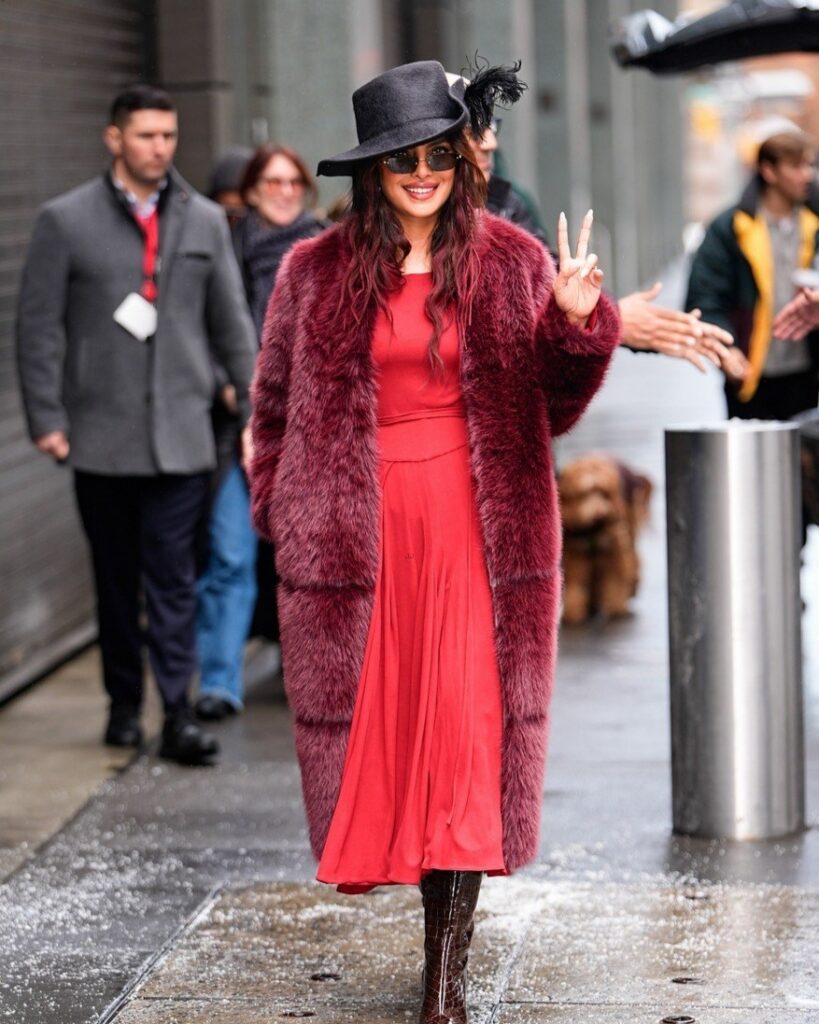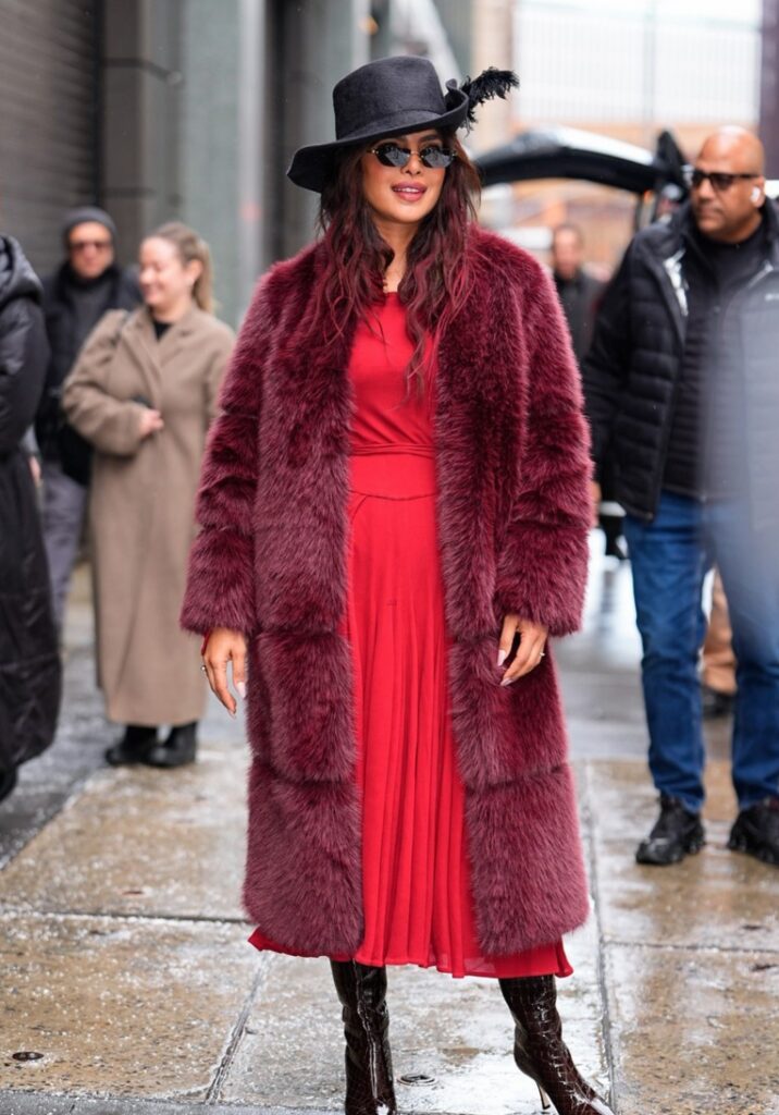 Para a ocasião, Priyanka usava um casaco de pele bordô sobre um vestido vermelho, combinado com um chapéu preto com uma pena, botas de salto marrom e óculos de sol pretos.