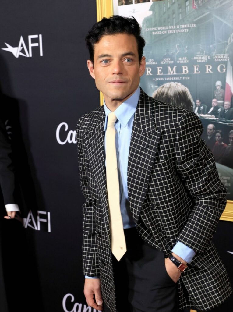 Rami usava um relógio Tank Louis Cartier, modelo médio, em ouro rosa 18k, com pulseira de couro; e o anel Les Berlingots de Cartier em ouro amarelo 18k com malaquita e diamantes. Ele vestia um traje da Valentino.