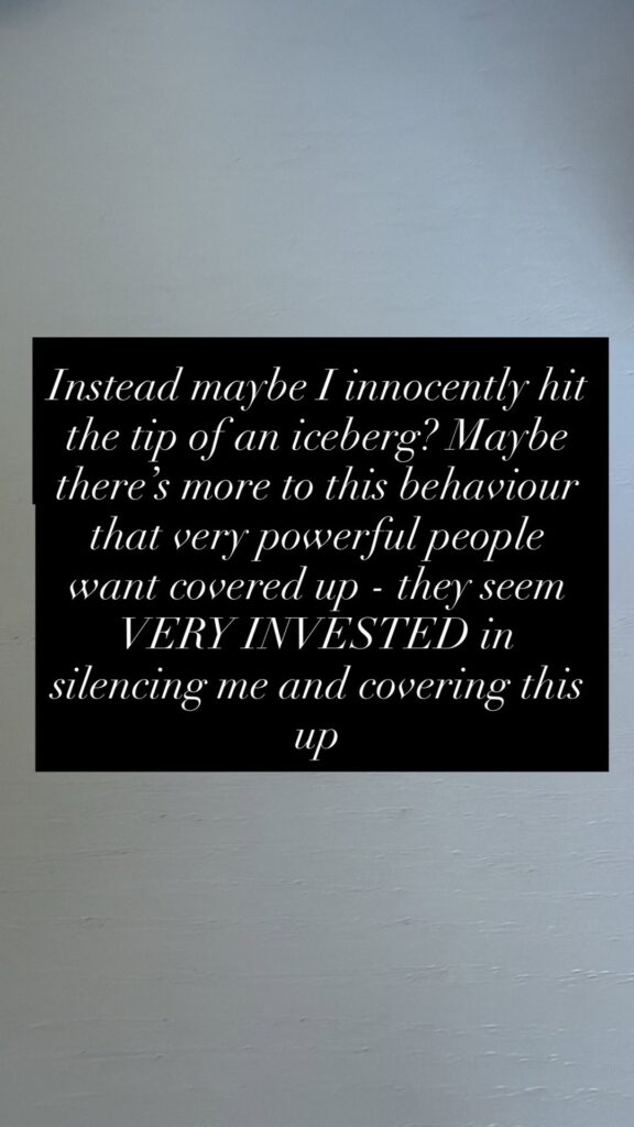 Instead maybe I innocently hit the tip of an iceberg? Maybe there’s more to this behaviour that very powerful people want covered up – they seem VERY INVESTED in silencing me and covering this up.