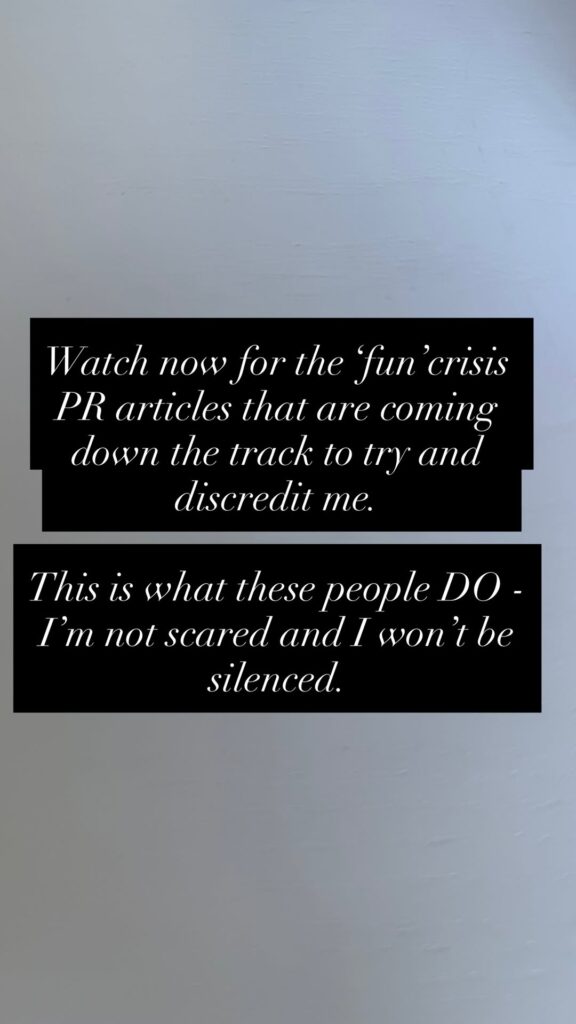 Watch now for the ‘fun’ crisis PR articles that are coming down the track to try and discredit me. This is what these people DO – I’m not scared and I won’t be silenced.