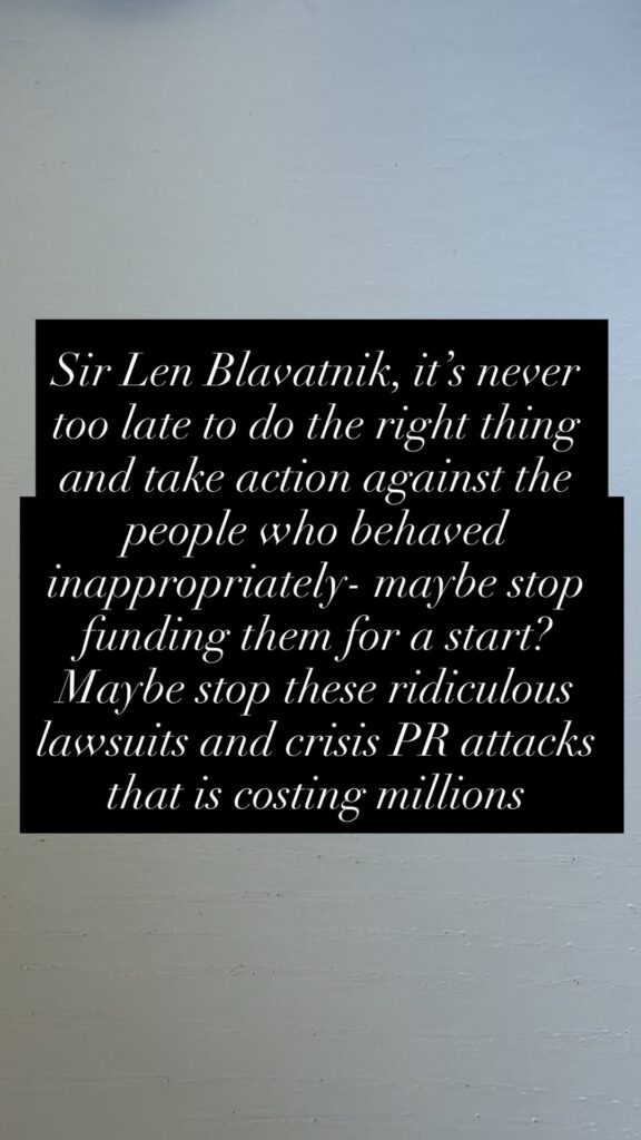 Sir Len Blavatnik, it’s never too late to do the right thing and take action against the people who behaved inappropriately- maybe stop funding them for a start? Maybe stop these ridiculous lawsuits and crisis PR attacks that is costing millions.