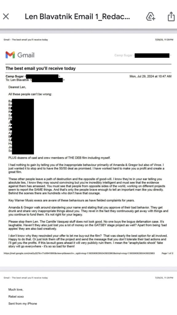 She then shared an email reportedly sent from her production company Camp Sugar to Blavatnik asking him to stop the producers’ alleged behavior and either remove them from the project or let her buy out the film.