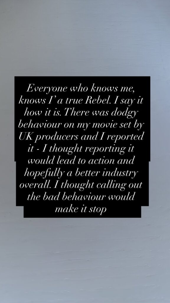 Everyone who knows me, knows I’ a true Rebel. I say it how it is. There was dodgy behaviour on my movie set by UK producers and I reported it – I thought reporting it would lead to action and hopefully a better industry overall. I thought calling out the bad behaviour would make it stop.