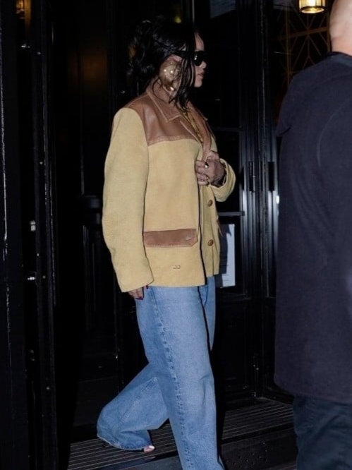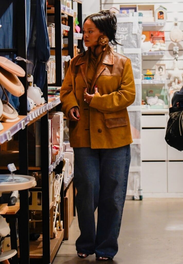 Rihanna wore a coat, jeans and furry earrings, and was seen looking at various items in the store before stepping out of the building.