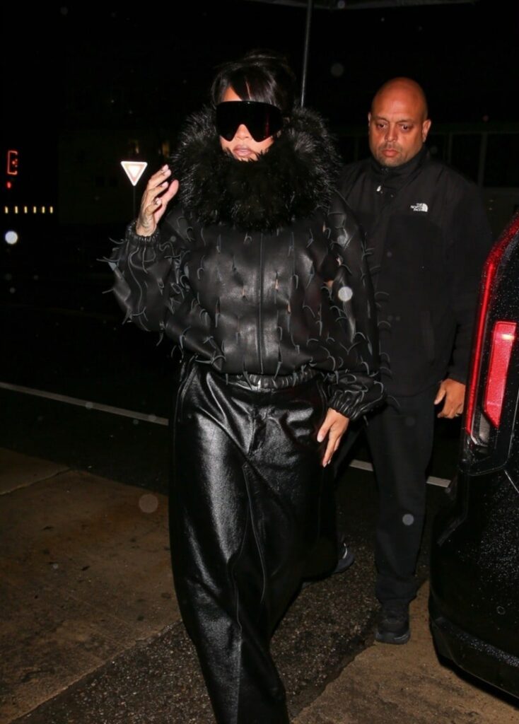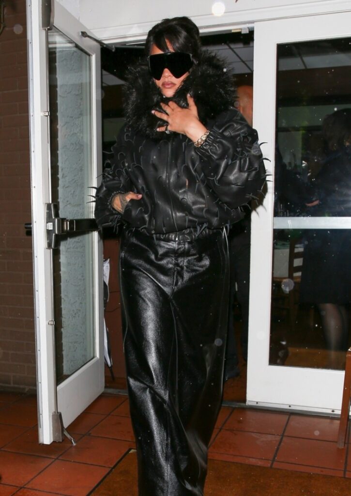 Rihanna usa look de couro com gola de pele para jantar em Santa Monica.