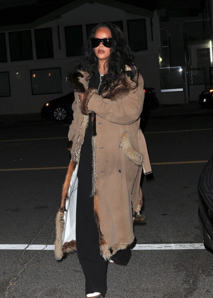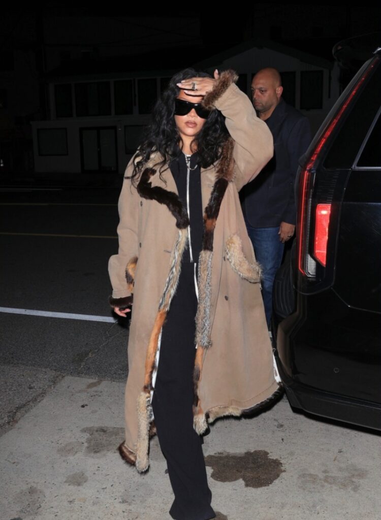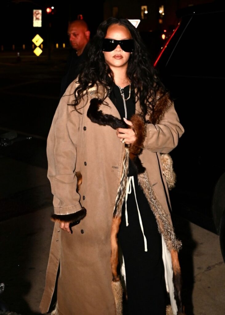 Rihanna visita restaurante badalado usando um longo casaco de camurça com detalhes em pele.
