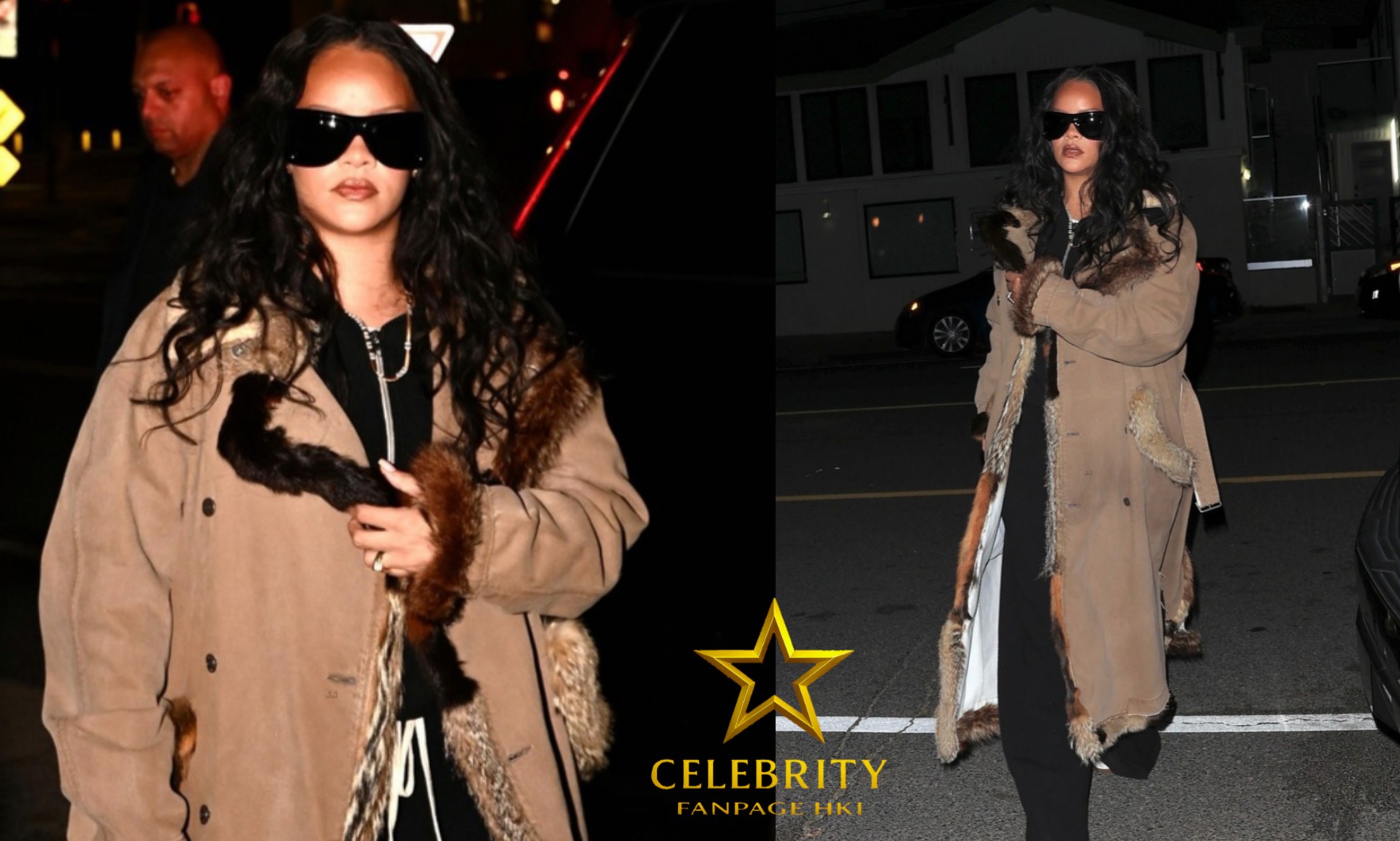 Para a ocasião, ela usava um longo casaco de camurça cor camelo com detalhes em pele. Por baixo, Rihanna vestia uma blusa preta com zíper e calças pretas de pernas largas. Ela completou o look com óculos de sol pretos grandes e sapatos de salto alto brancos de bico fino.