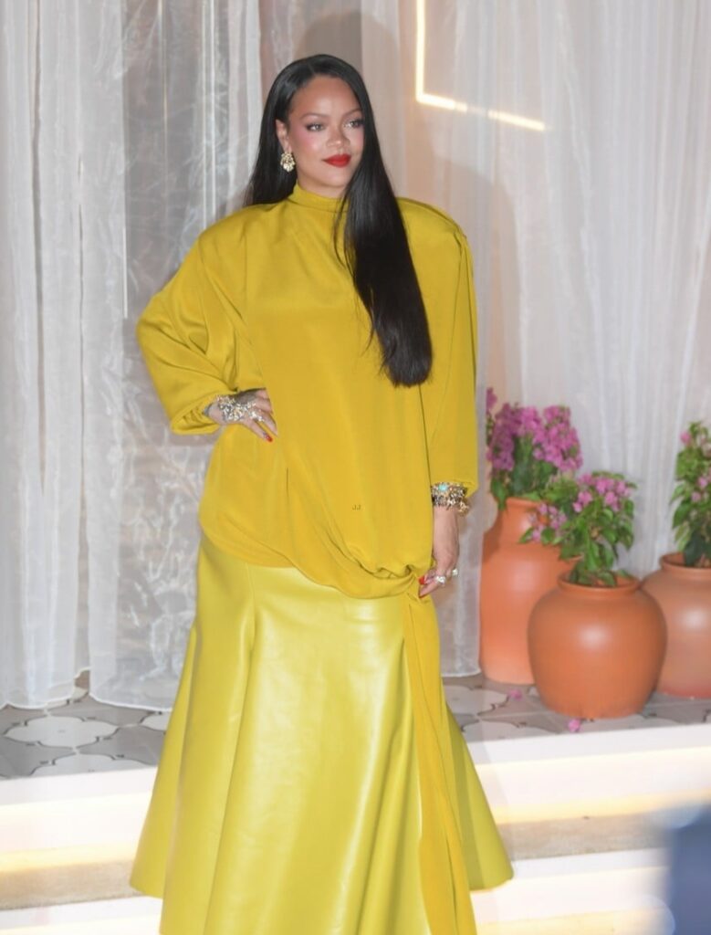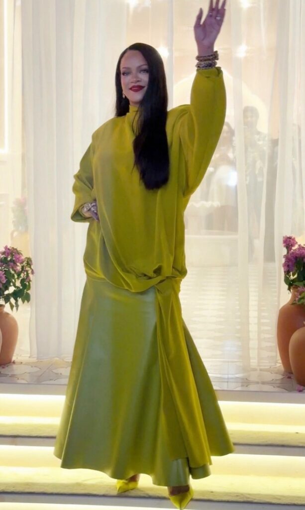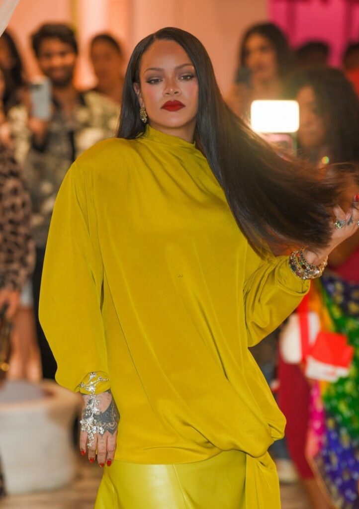 For the Fenty Beauty kick-off celebration, Rihanna wore custom Mugler, a Fall Winter 2026 chartreuse fluid crepe cascade dress and leather mermaid skirt. She paired it with a signature Manish Malhotra Haathpool; an exquisite hand adornment crafted in white gold and set with uncut diamonds.