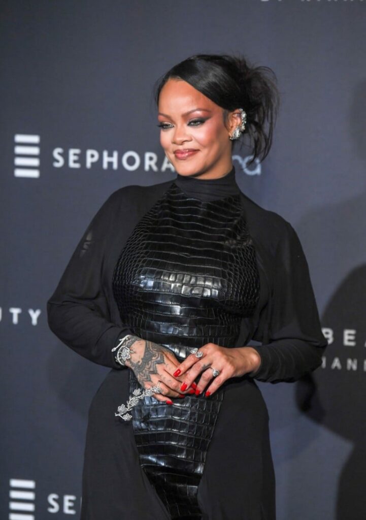Later, at the after-party, the “We Found Love” singer stepped out in a custom Alaïa fit-and-flare jersey dress with V-shaped crocodile leather cutouts inspired by the Summer Fall 26 collection by Pieter Mulier.