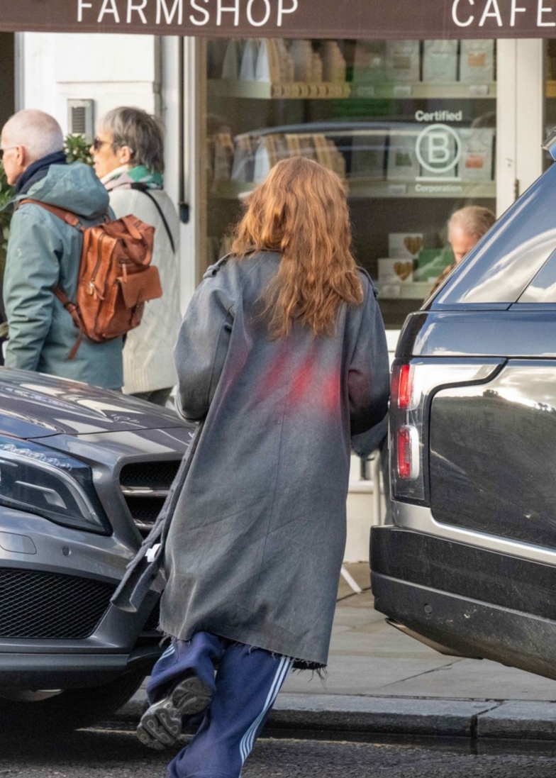 Vestida com um longo casaco cinza com um cachecol combinando e calça de moletom azul por baixo, a atriz ruiva foi vista procurando por um Range Rover até que ele finalmente chegou para buscá-la momentos depois.