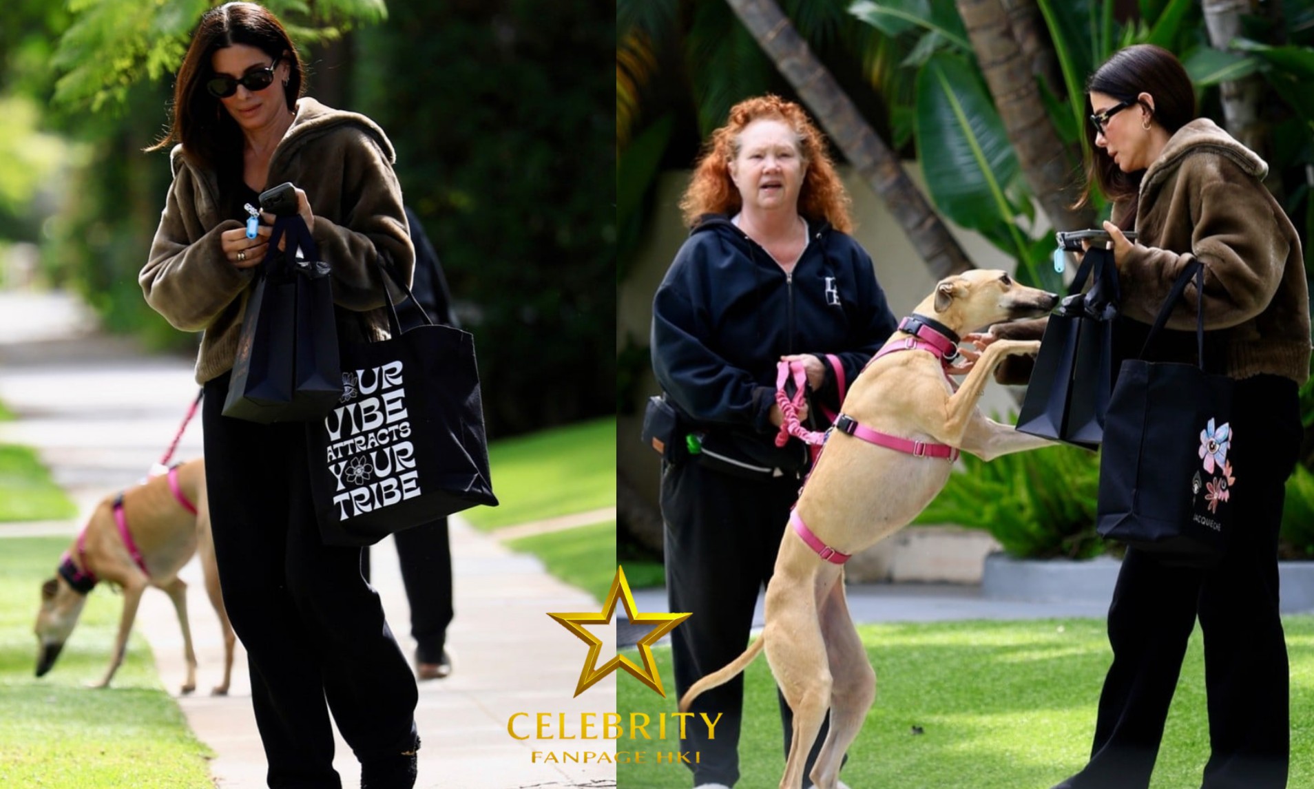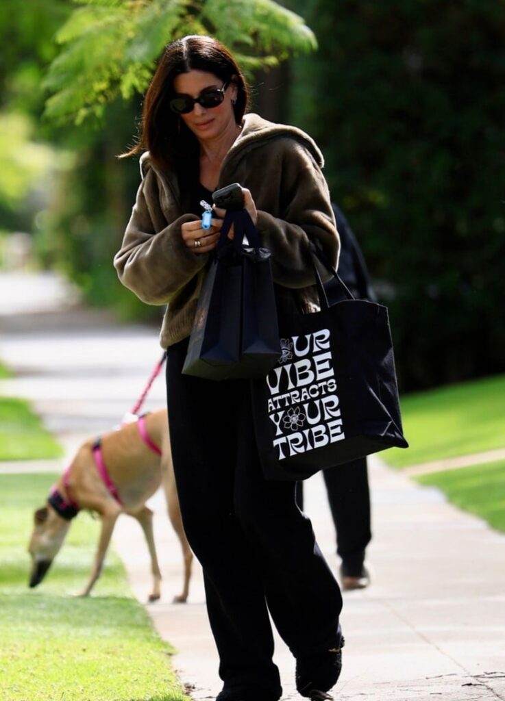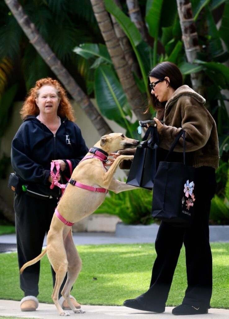 Sandra Bullock é recebida por um cachorro amigável durante passeio em Beverly Hills.