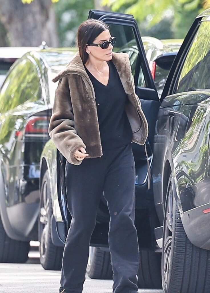 Sandra vestia uma jaqueta marrom com capuz de pele sintética sobre uma blusa preta e calças de pernas largas. Ela também usava óculos de sol pretos e carregava uma bolsa Jacquie Aiche, além de uma sacola.