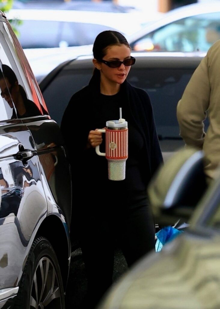 Ela usava um longo casaco preto e óculos de sol, com o cabelo preso em um rabo de cavalo baixo e elegante. A cantora de “In the Dark” carregava o que parecia ser uma garrafa térmica Stanley Quencher personalizada, decorada com strass vermelhos e brancos.