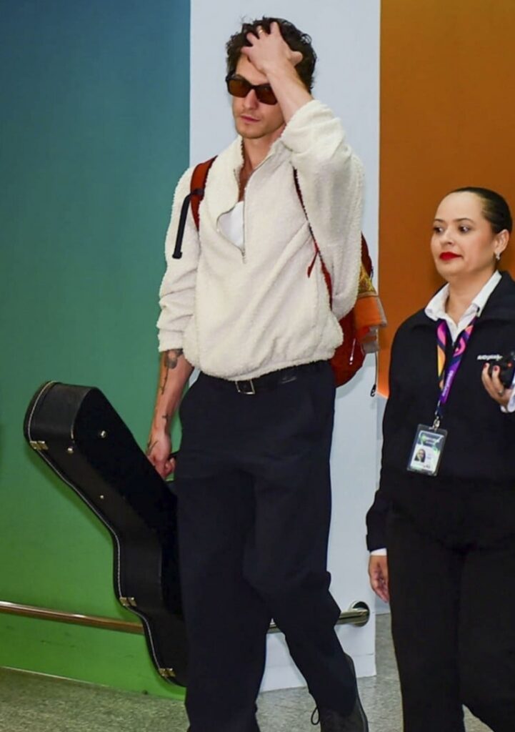 O cantor de 26 anos foi visto chegando ao Rio de Janeiro com uma aparência relaxada e foi fotografado saindo do aeroporto com seu estojo de guitarra na mão.