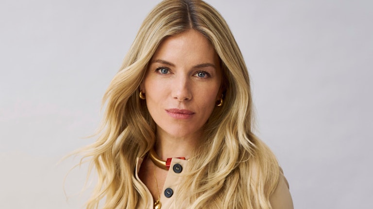 Sienna Miller just complimented my cowboy boots. They’re years-old Mango, could pass for Ganni, if you squint. ‘Next time say they’re vintage,’ she winks. It’s late morning and we’re tucked away in a quiet corner of a members’ club in Fitzrovia. Naturally, Miller’s own get-up outshines every designer ensemble in the building – the lace of a snow-white Carolina Herrera slip dress just visible beneath a classic Burberry trench, and a weighty mixed-metal necklace by Paris-based jewellery designer Gabrielle Greiss delivers Miller’s signature bohemian flair. ‘I love how whimsical it looks,’ she says, tinkering with the large silver moon at its centre.