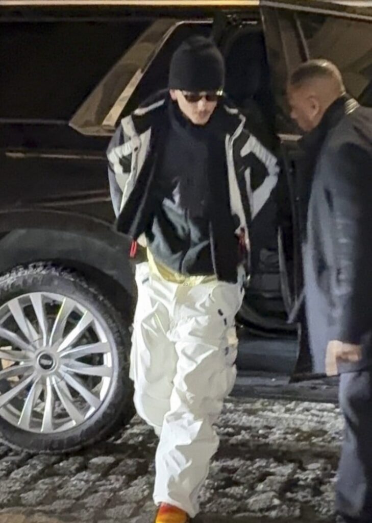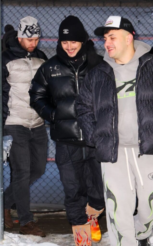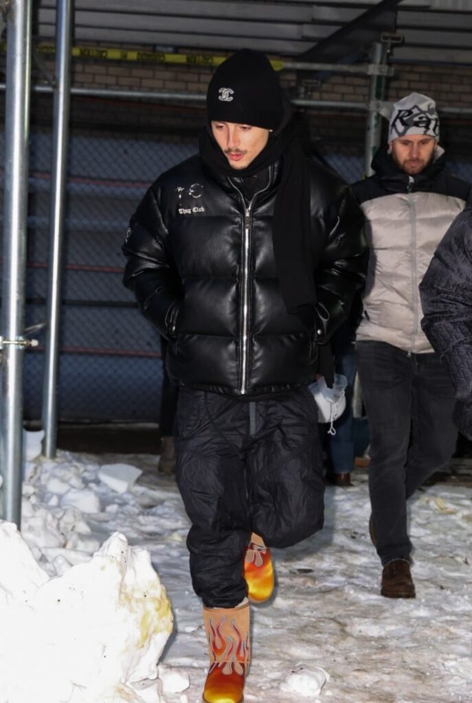 Mais tarde, ele foi visto gravando uma campanha para a revista W em Brighton Beach, no Brooklyn. Para a sessão de fotos, o ator estava todo agasalhado com uma jaqueta puffer preta, um gorro da Chanel e botas com estampa de chamas.