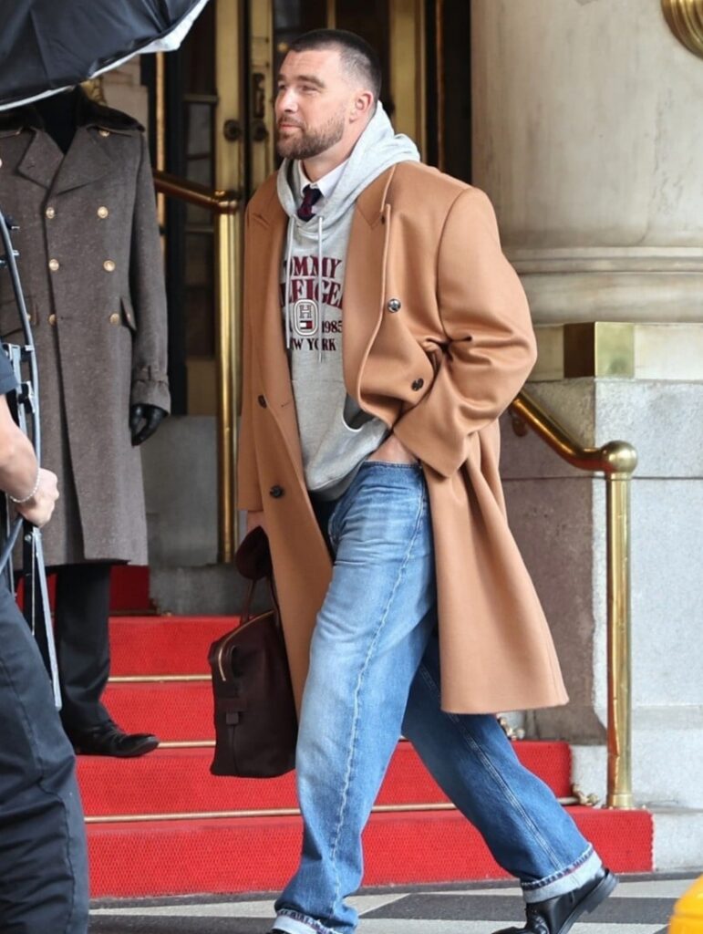 Earlier in the day, Travis was seen wearing a tan coat over a gray hoodie and jeans paired with black boots and carrying a brown leather bag as he posed for photos outside of the Plaza Hotel.