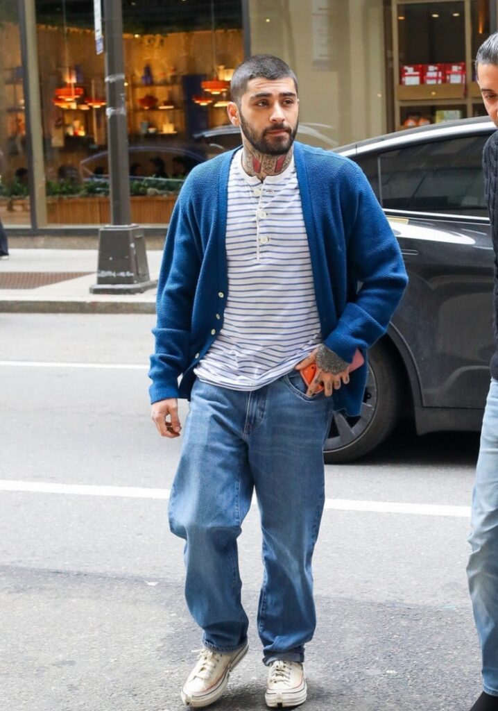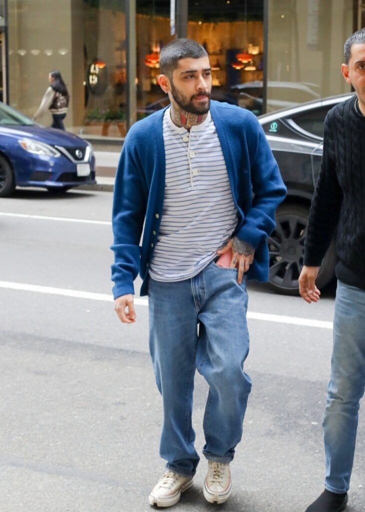 For his day out, Zayn sported a blue cardigan over a striped shirt paired with jeans.