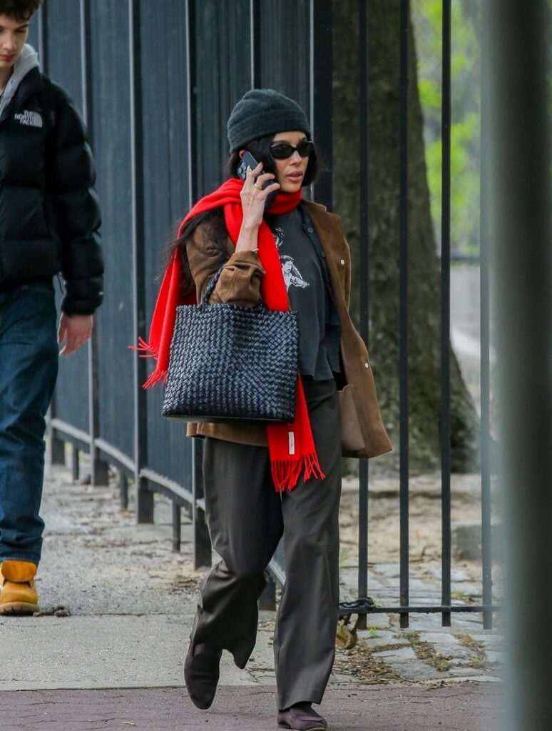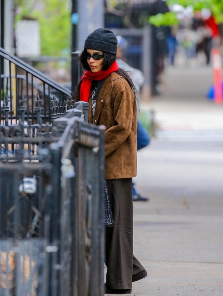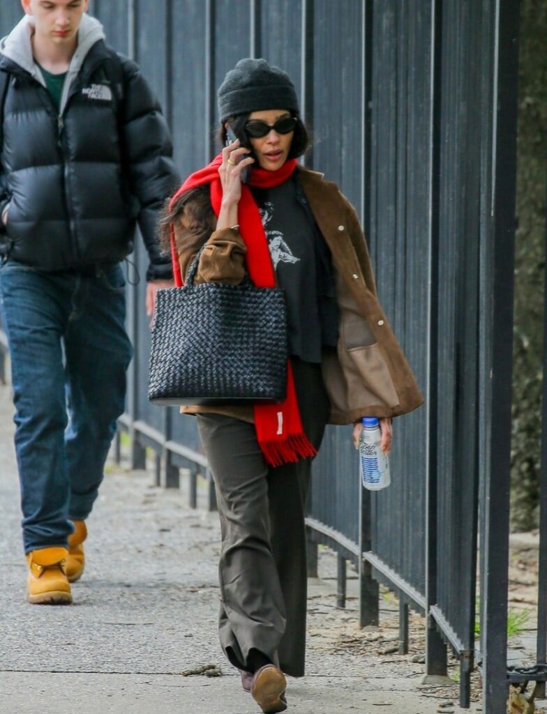 For her outing, Zoe wore a tan suede jacket over a black T-shirt paired with gray pants and brown loafers. She accessorized the look with a black knit hat, red scarf, and sunglasses as she carried a black woven bag.